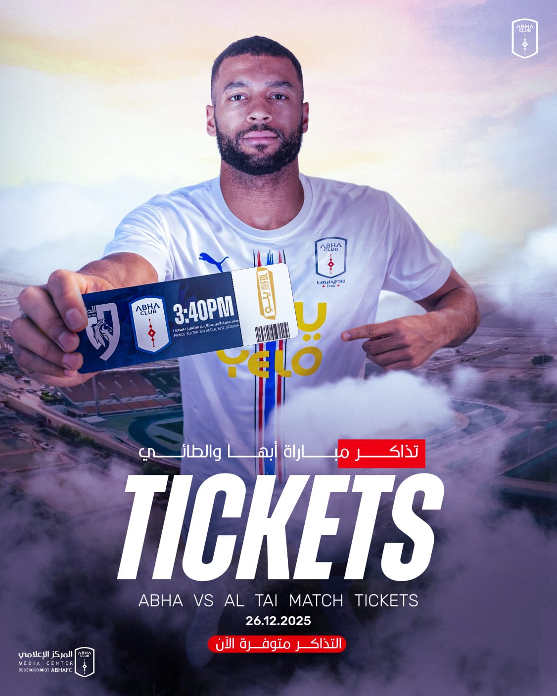 تذاكر مباراة أبها مع الطائي على ملعب المحالة، مُتاحة الآن للحجز مجانًا عبر الموقع الإلكتروني